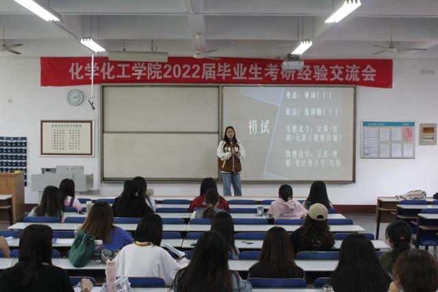 本次活动由五位考研成功上岸的同学从不同的角度分享他们的考研经验。许文倩结合自身大学四年学业规划、考研心路历程和备战经验,从院校专业选择、复习计划制定、学习资料获取、学习方法探讨以及心理情绪调适等五个方面进行了经验分享,鼓励学弟学妹们要增强信心、坚定信念、持之以恒,同时告诫同学们要找准定位,认真备考,克服一切困难将考研这场信息战、孤军战、持久战进行到底。井波主要讲述了四大化学的学习方法,强调备考计划的重要性。在备考过程中,应合理规划学习时间、提高学习效率,她从自身实际出发,针对每个科目如何复习做了详细的阐述,她特别指出,在复习中不仅要积累经验和掌握技巧,更要以平常心看待考研并勇于肯定自己。 姬鸿飞同学,分析了当前考研的总体形势,提醒同学们要重视公共课的准备,从真题入手,提高对课本的重视程度,以练促学。王雪婷指出考研一方面是为了就业,另一方面也是为了改变出身,为自己更好的发展打下基础。对于如何考研,她分别从专业、英语、政治三方面分析,指出专业复习上,要依据考试大纲,多做题、多整理;英语方面,要多练习并重视卷面书写;政治方面,要注意答题时的条理。郑钧文提到如何做好详实可行的考研计划及研究生期间的课程设置和发展前景,讲述考研的原因及优势所在。宣讲结束后,分享者与现场学生交流互动,对现场同学在学习和备考中提出的问题和疑惑进行了耐心细致的解答,现场氛围热烈。