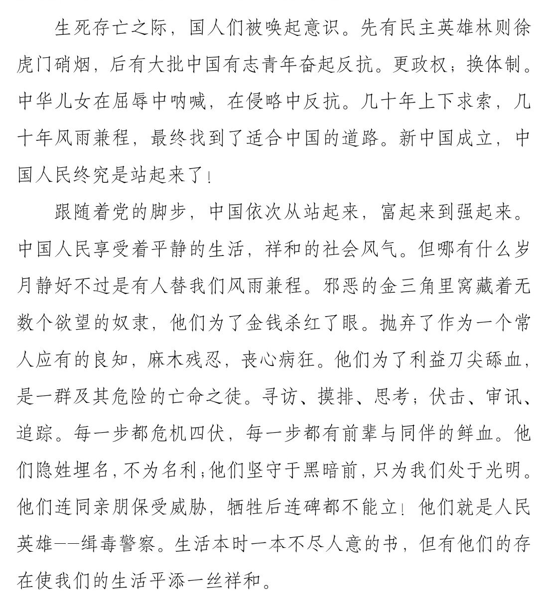 本次活动以“健康人生,绿色无毒”为主题,要求征文作品表达出远离毒品、热爱生活、抵制诱惑等积极健康的价值追求,告诫同学们远离毒品,永远拒绝尝试“第一口”。活动伊始,参赛学生通过互联网查找相关资料,从身心健康、个人发展、家庭影响等方面对毒品的危害进行叙述,展开议论,并普及了预防毒品的有效方法,呼吁大家积极学习禁毒知识,加强识毒防毒拒毒的意识和能力,争做禁毒宣传员,构筑起校园拒绝毒品的坚强防线。作品上交后,评委们以文章表述清晰、用词准确、主题鲜明、情感表达感染力强等方面为依托,坚持思想性和艺术性统一的原则挑选优秀作品,最终,汪子淇、张燕茹、郝文婧三位同学荣获本次比赛的一等奖。