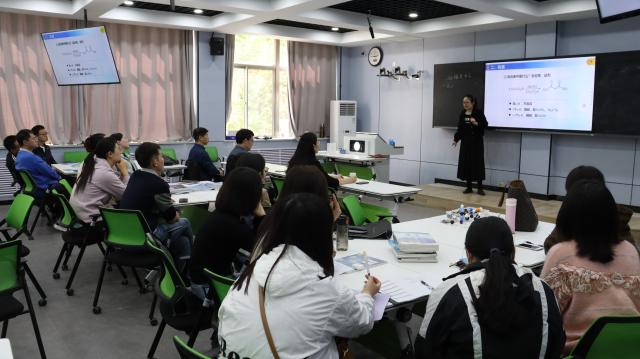 活动伊始,辛纳纳随机抽取教学节段,进行20分钟的课堂教学,她围绕“羧酸及其衍生物”展开,重点讲解了有关“酯缩合反应”的知识点,由表及里、层层递进,并合理运用思维导图,加深大家对教学内容的认识,充分展示了自己作为青年教师的教学基本功和教学水平。课堂教学结束后,赵岭和匡萍针对现场教学情况进行教学指导,结合自身经验从教学内容、教学设计、教态等方面指出辛纳纳在教学过程中存在的问题和不足,给出在教学过程中多引用现实生活事例的建议,帮助大家更好地理解教学内容。两位评委跨学科的精彩点评让在场老师都受益匪浅。辛纳纳再次抽取教学片断进行课堂教学,在第二次教学展示中,她吸取专家的指导意见,纠正了自身的问题,让教学内容更加通俗易懂,同时评委们也对本次课堂教学给出了较高评价。
